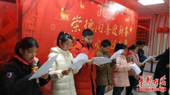 (年悦读社的孩子们在社区庆典上为社区志愿者们朗诵赞诗。)