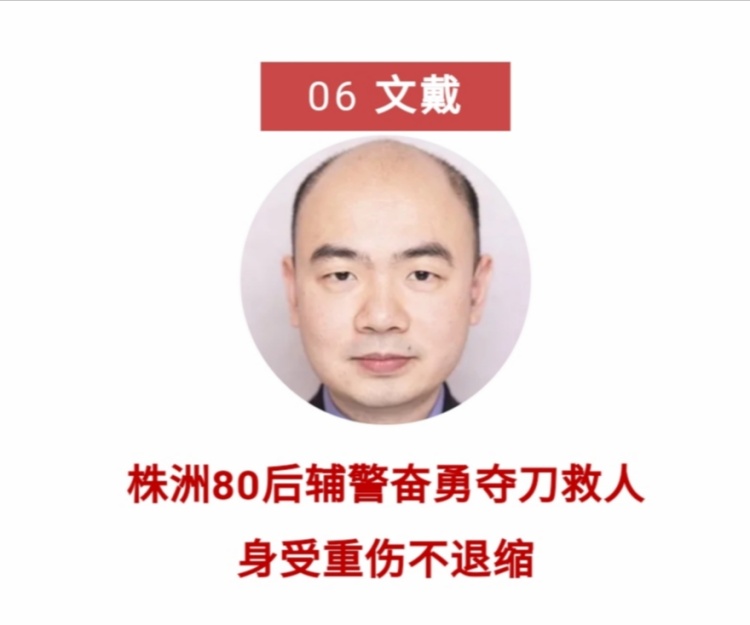 文戴,株洲攸县公安局交警大队事故股辅警。无业人员周某曾因交通肇事罪被判刑,但因心理不平衡,多次到交警大队骚扰办公。2020年4月7日下午,在交警大队办公楼,周某持弹簧刀刺向事故股教导员刘平,两人撕打在一起。闻讯赶来的文戴毫不犹豫上前阻拦,两手使劲按住周某握刀的手,试图夺下弹簧刀。为了挣脱束缚,穷凶极恶的周某拿刀刺向文戴的大腿,顿时鲜血直流。文戴没有退缩,仍死死按住周某握刀的手不放,让周某动弹不得,其余民辅警闻讯赶来,合力将刀夺下,将歹徒制服擒住。