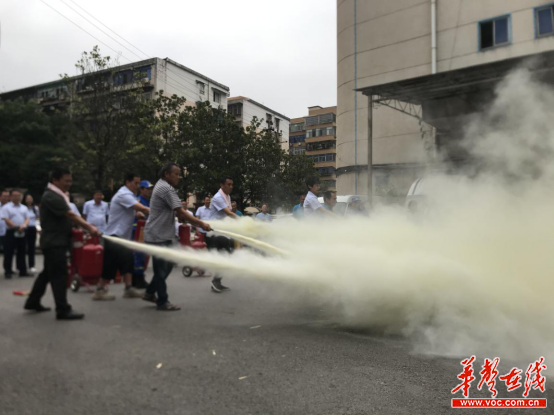 在确认全员安全疏散后,湖南省红十字救援队队长金灿点评了疏散情况,演示使用灭火器灭火的全过程,并安排大家一一实操学习。