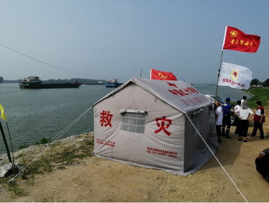 岳阳市红十字会组织志愿者在洞庭湖大堤上值守