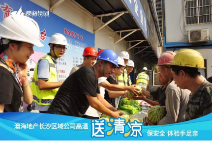 对奋战在一线的工人们开展夏日送清凉活动,为他们发放西瓜、凉茶、毛巾香皂等防暑降温用品。让一线工人们感受到烈日酷暑下,来自澳海的清凉和关爱。
