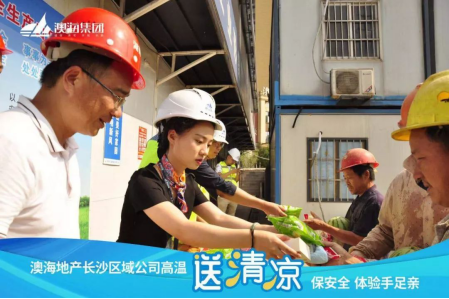 华声在线讯 炎炎夏日,骄阳似火,入夏以来,长沙地区持续高温,日最高气温已达35度以上,澳海的一线工人们依然顶烈日、冒酷暑,奋战在各自岗位上。为落实集团人文关怀、保障广大一线工人的身体健康,鼓舞一线工人士气,强化安全生产意识,促进工程管理正常开展,保障安全生产作业,长沙澳海开展了“高温送清凉,保安全,体验手足亲”活动。深入工地进行安全大检查,对施工人员进行安全教育宣讲,同时为奋斗在一线的建筑工人发放藿香正气水、毛巾、香皂、西瓜、凉茶等防暑降温物品表示感谢和慰问。